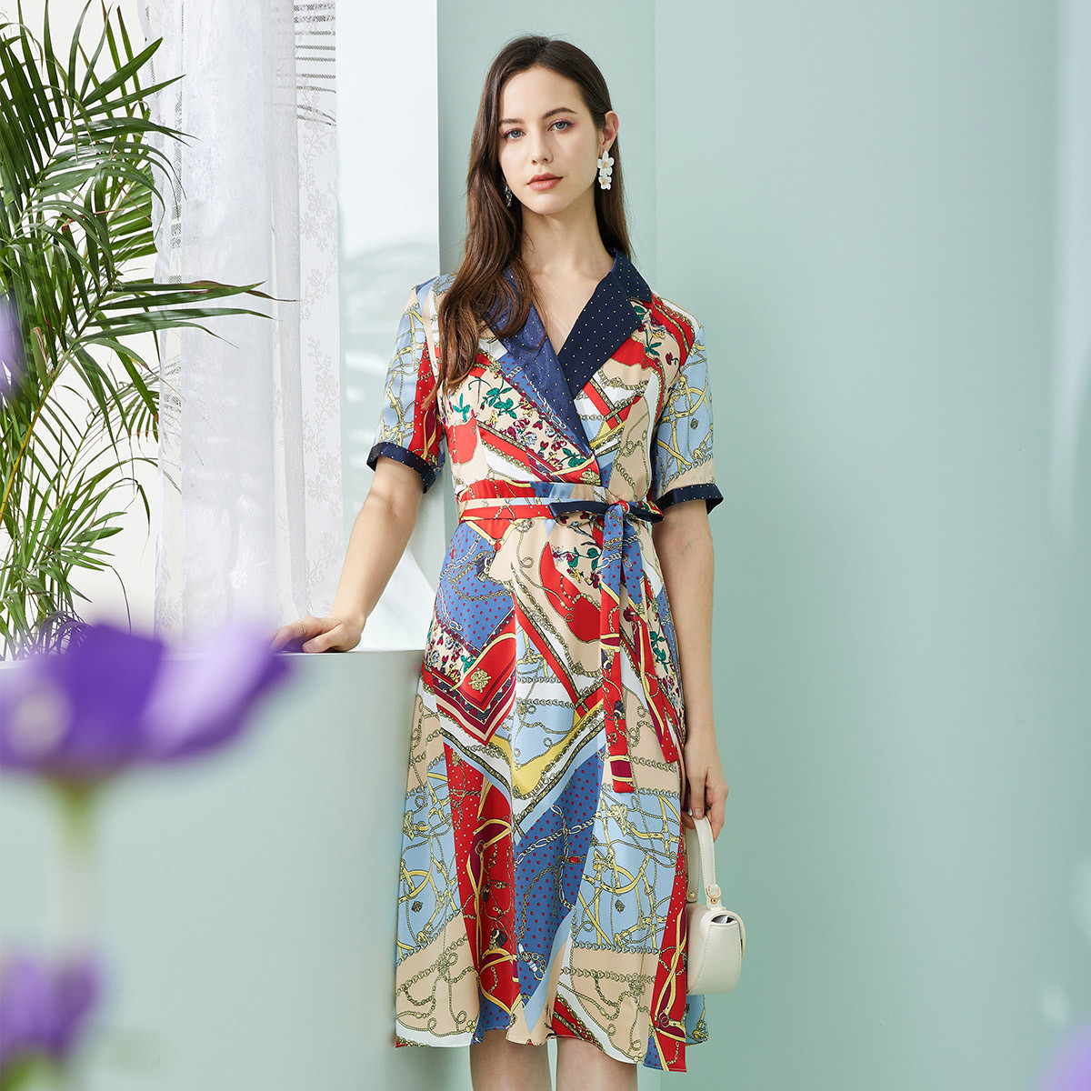 商场同款秋季赫本风法式印花优雅撞色修身烫钻撞色翻领连衣裙 302623
