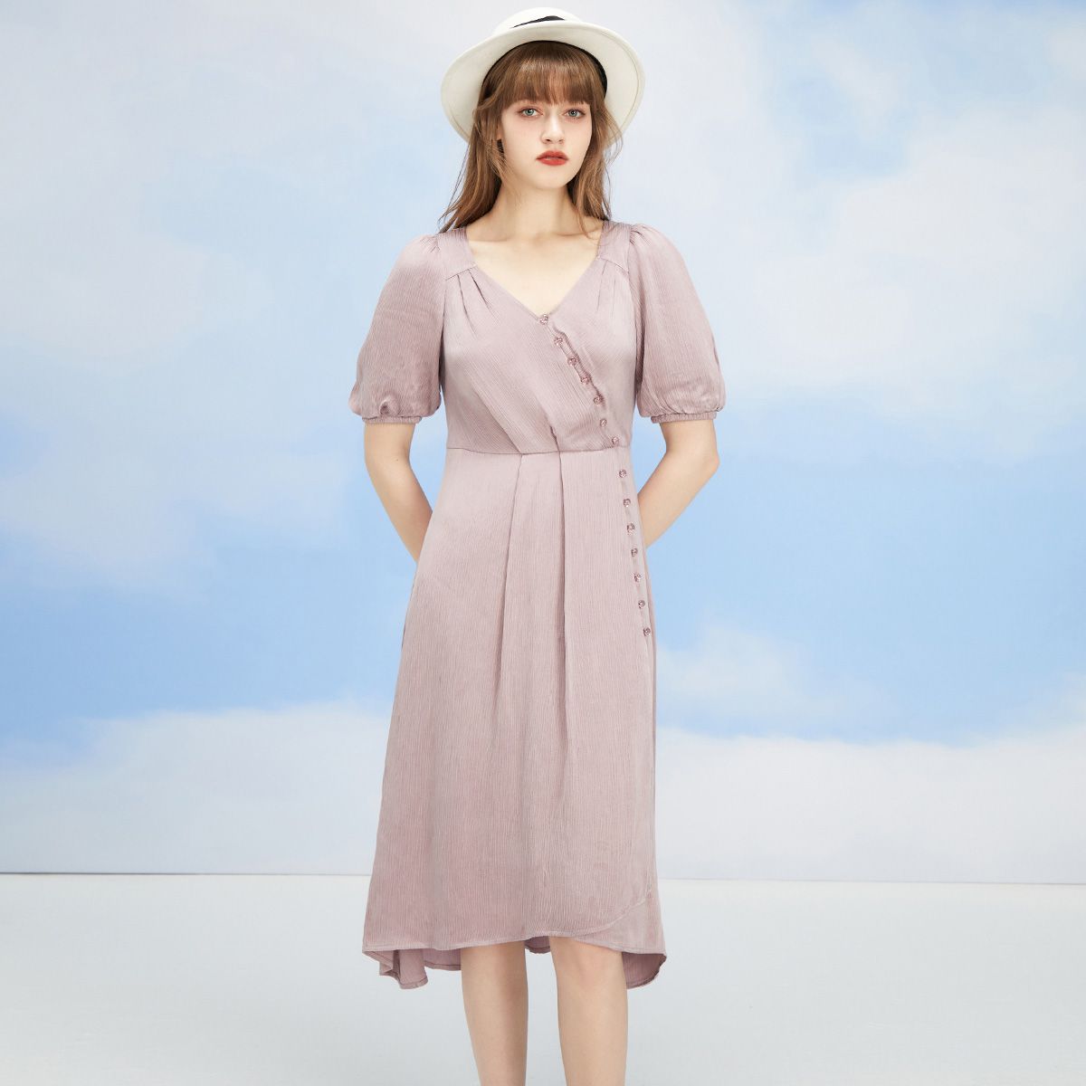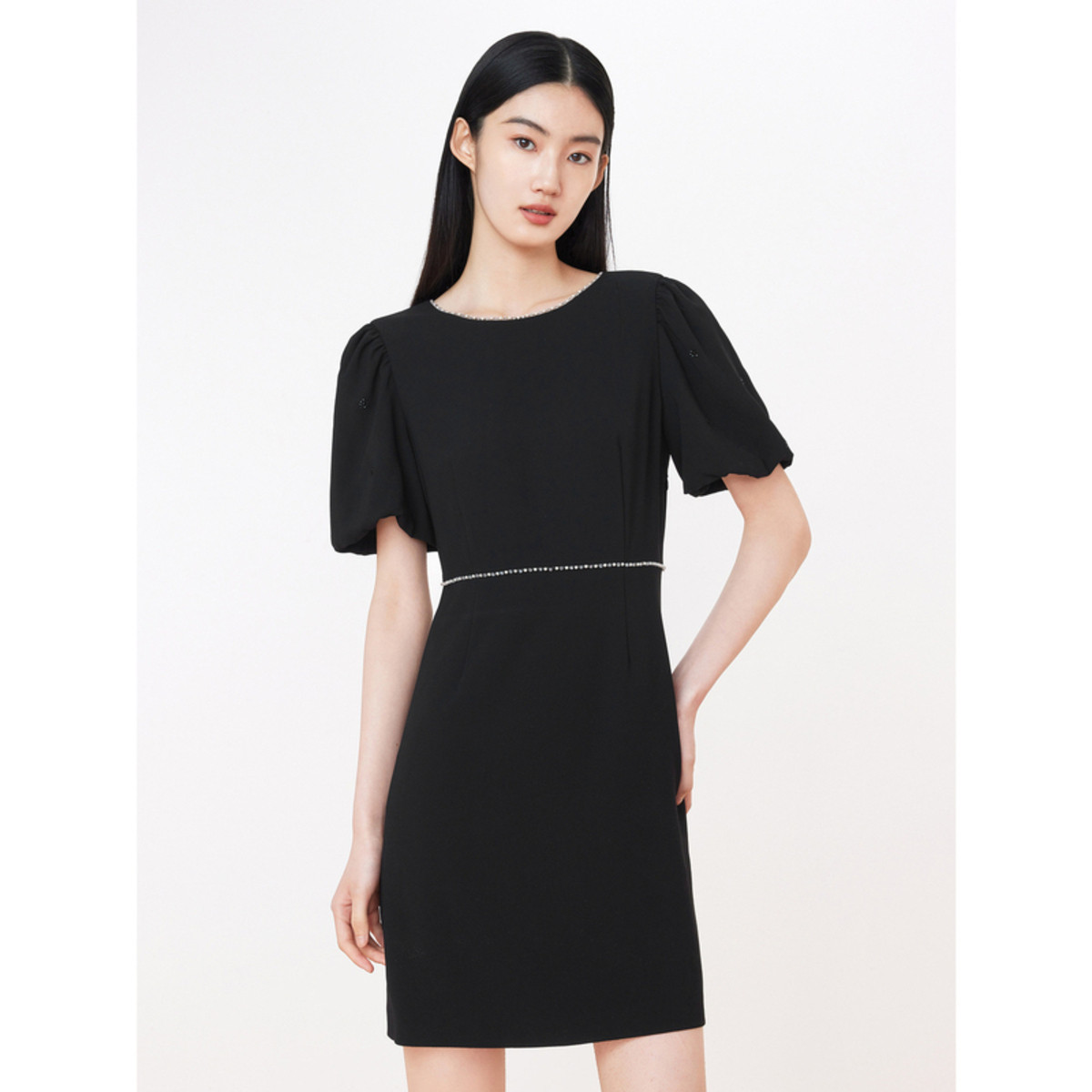 旗下安娜蔻系列洋气通勤风泡泡袖收腰醋酸中长款连衣裙女装夏新 918092