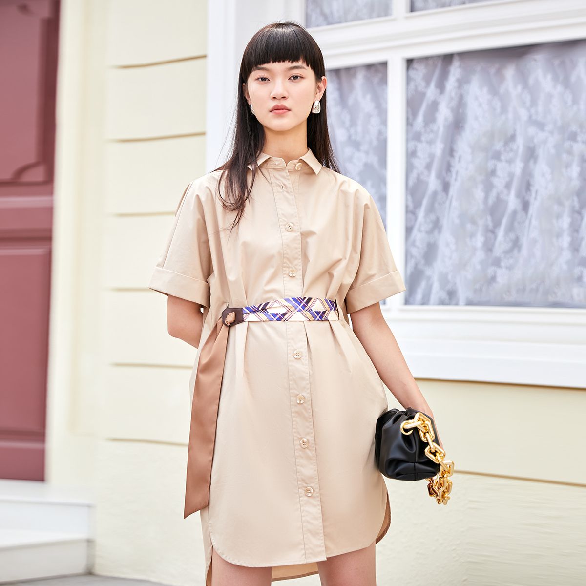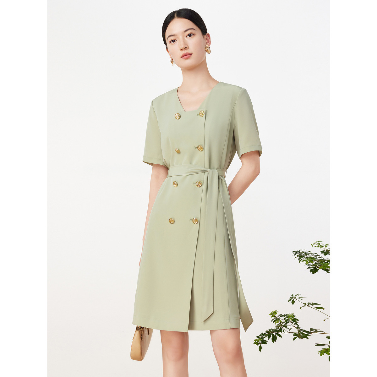 玖姿旗下安娜蔻系列简约通勤OL风收腰中长款短袖连衣裙女夏季 399116