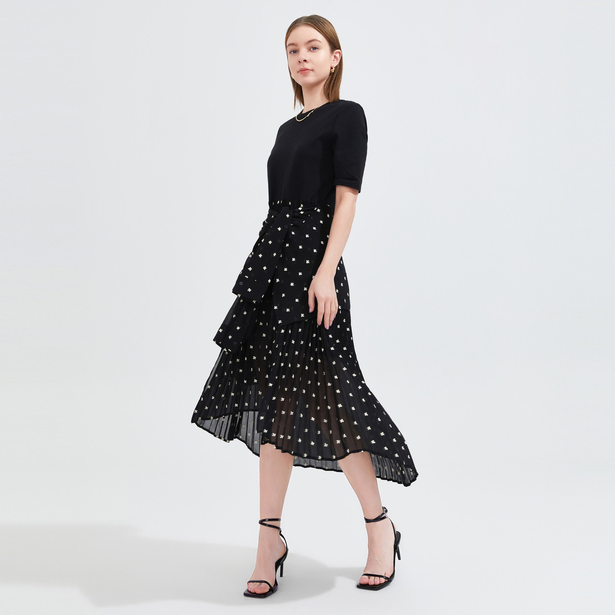 JZ玖姿四叶草绣花开衩夏季设计感开衩连衣裙 685132