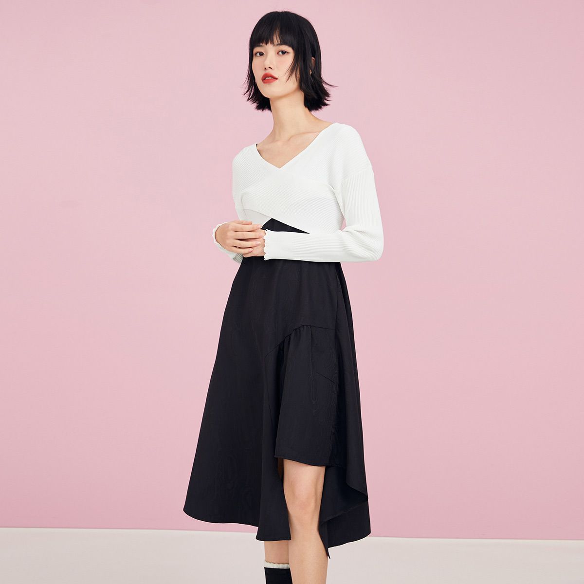 【春秋专柜款】吊带纯色A字收腰七分袖针织衫连衣裙女 983121