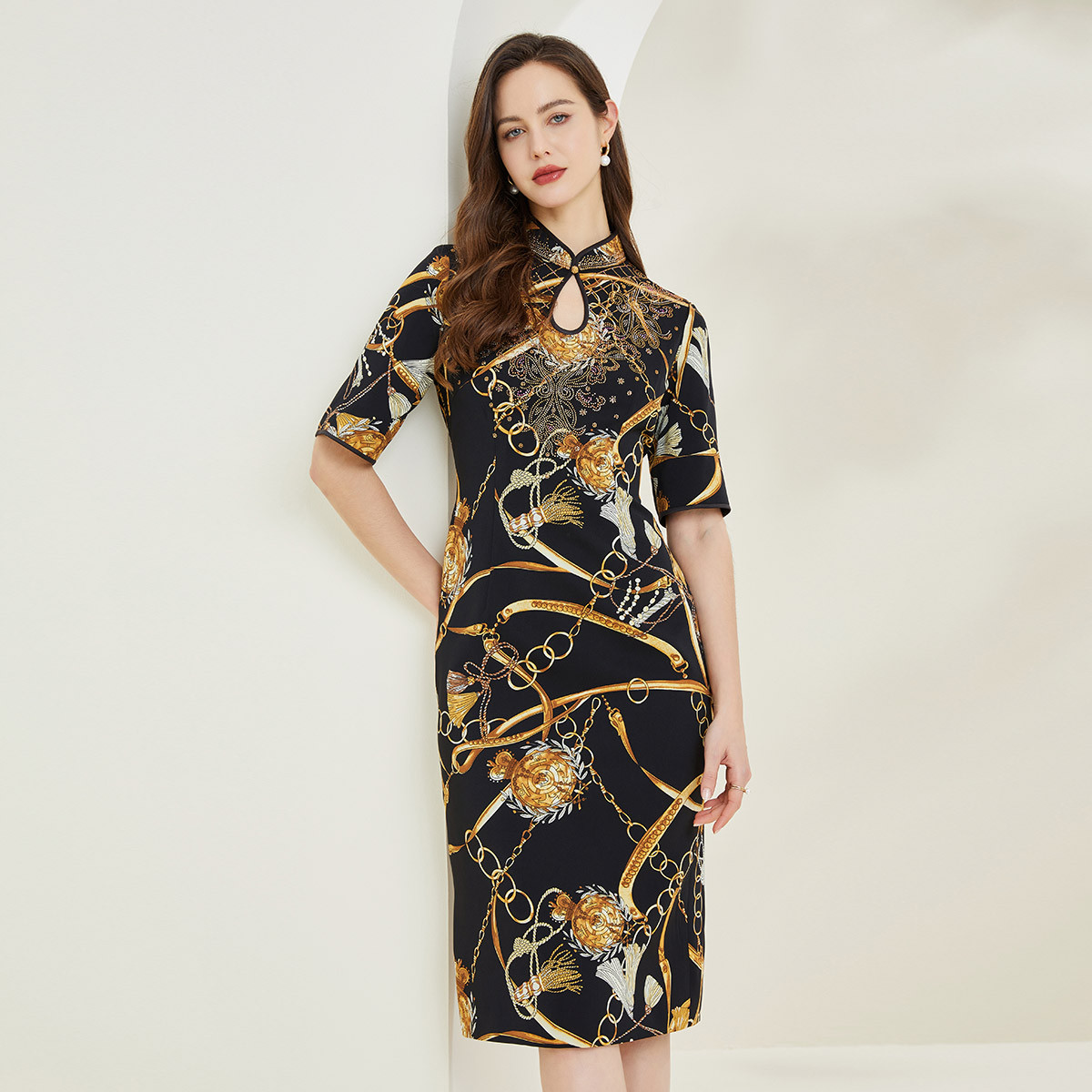 秋季链条印花修身旗袍款水滴立领连衣裙 947551
