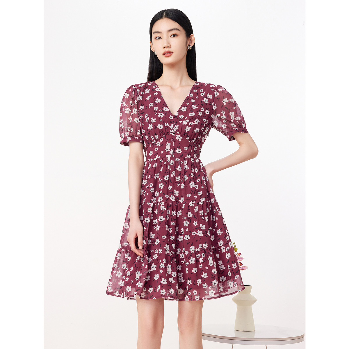 玖姿旗下安娜蔻系列收腰印花连衣裙女装夏季V领轻盈感裙子 981964