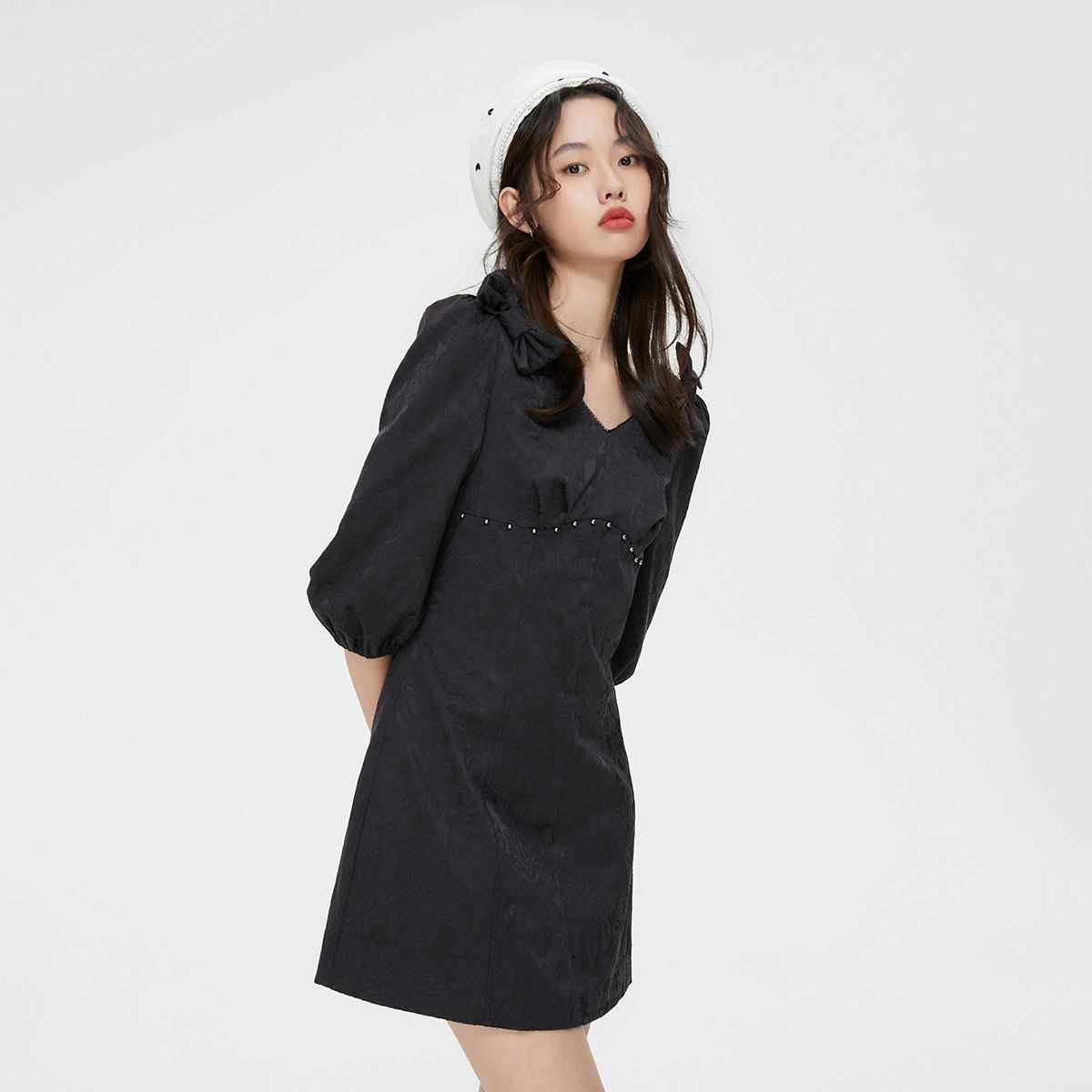 【福利款】夏季方领灯笼袖短款小黑裙法式连衣裙女 076954