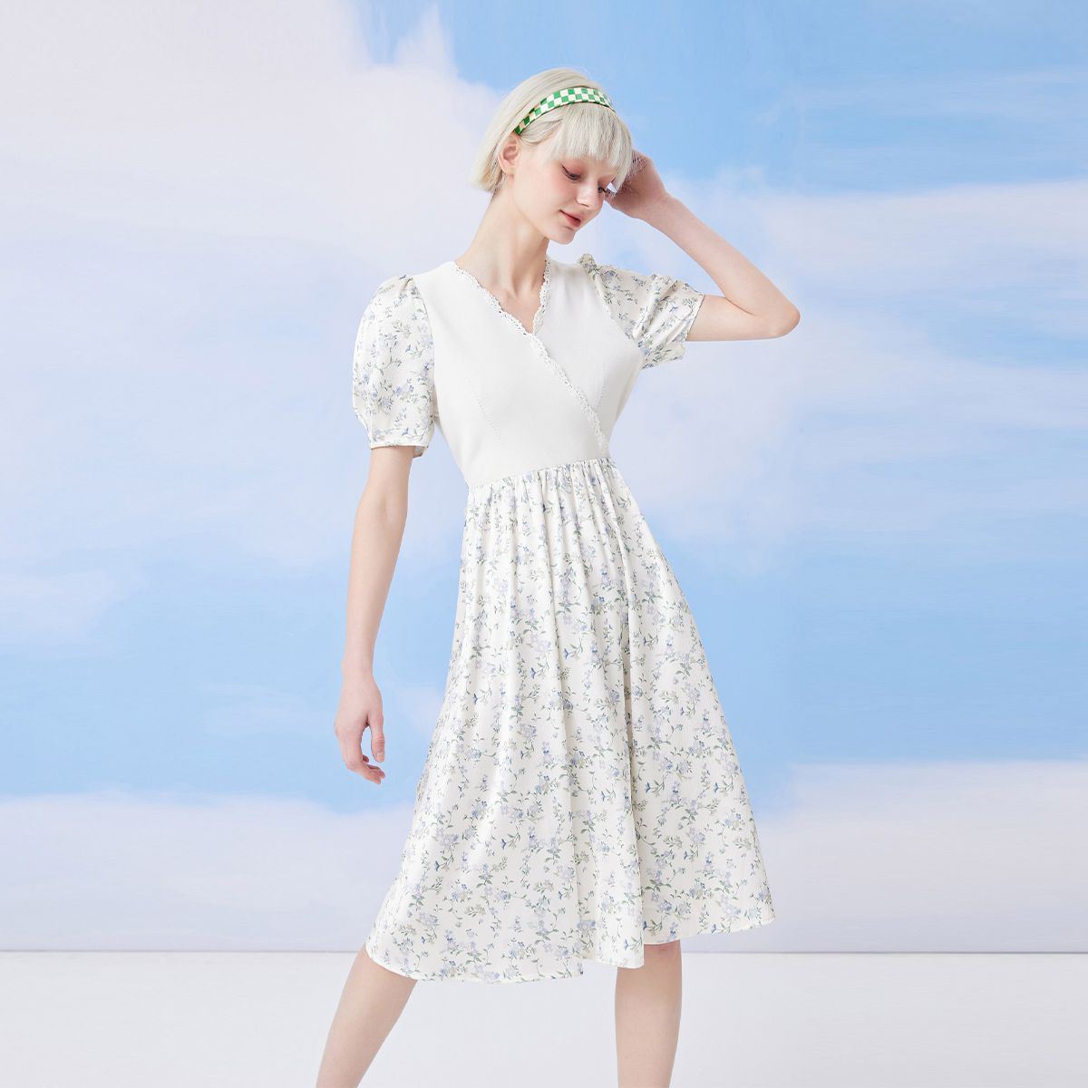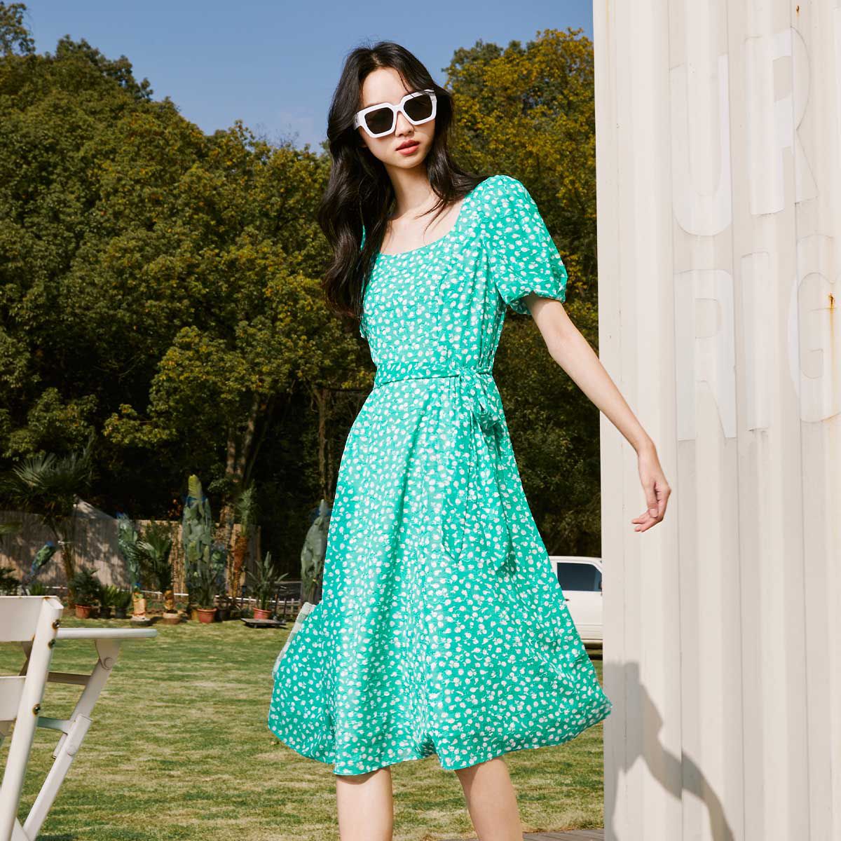 【泡泡袖】夏季收腰碎花中长款连衣裙女 607194