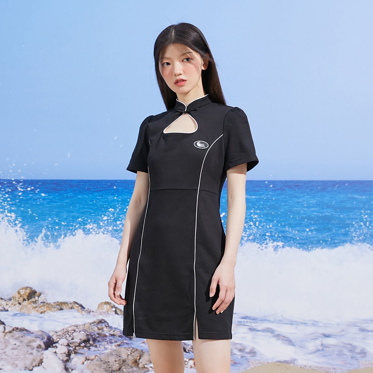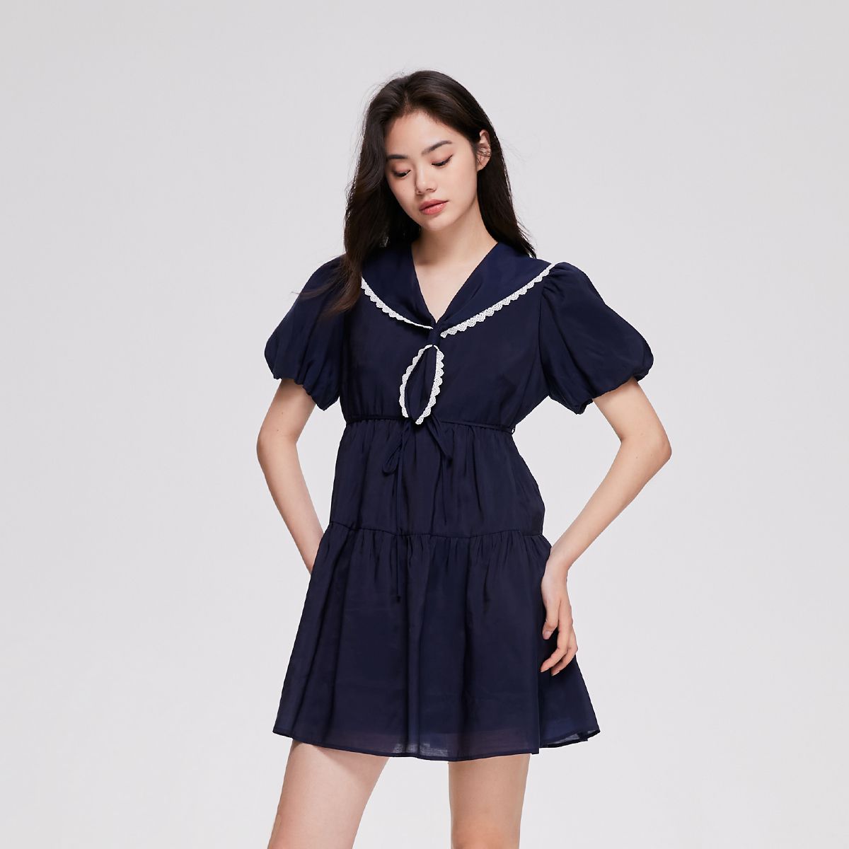 【海军领】夏季开叉花苞袖收腰短款连衣裙女 008154