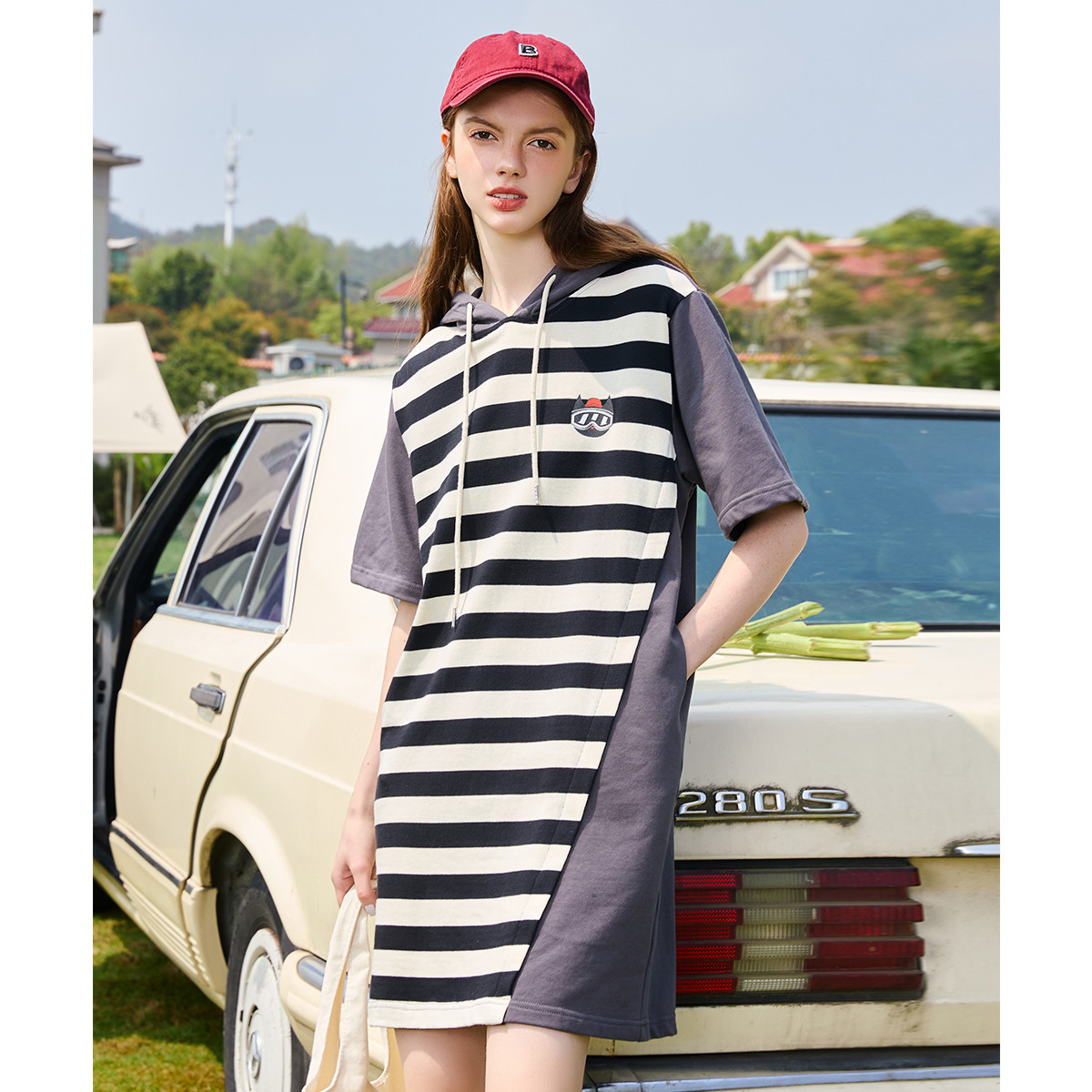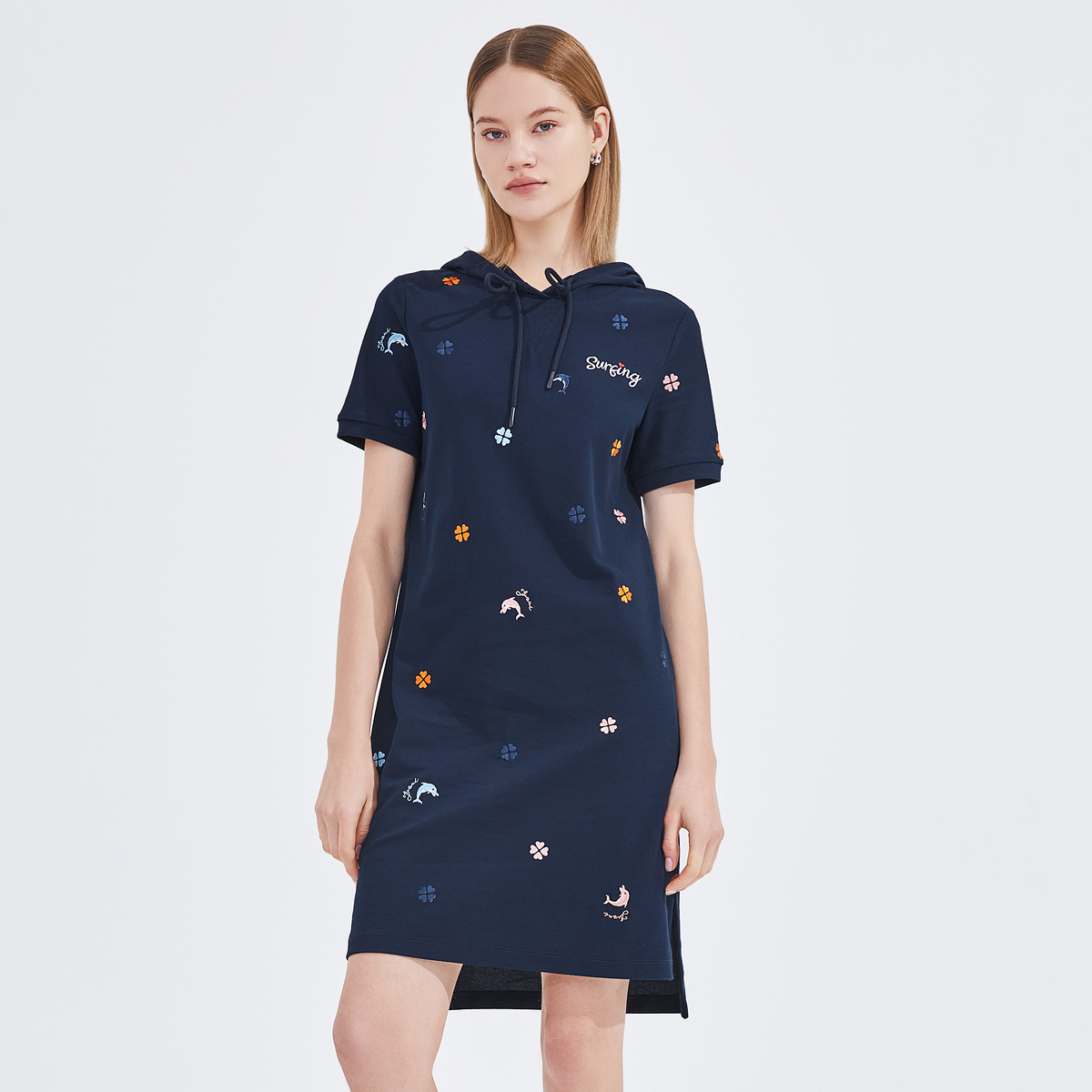玖姿夏季四叶草连帽运动风直筒连衣裙 257804