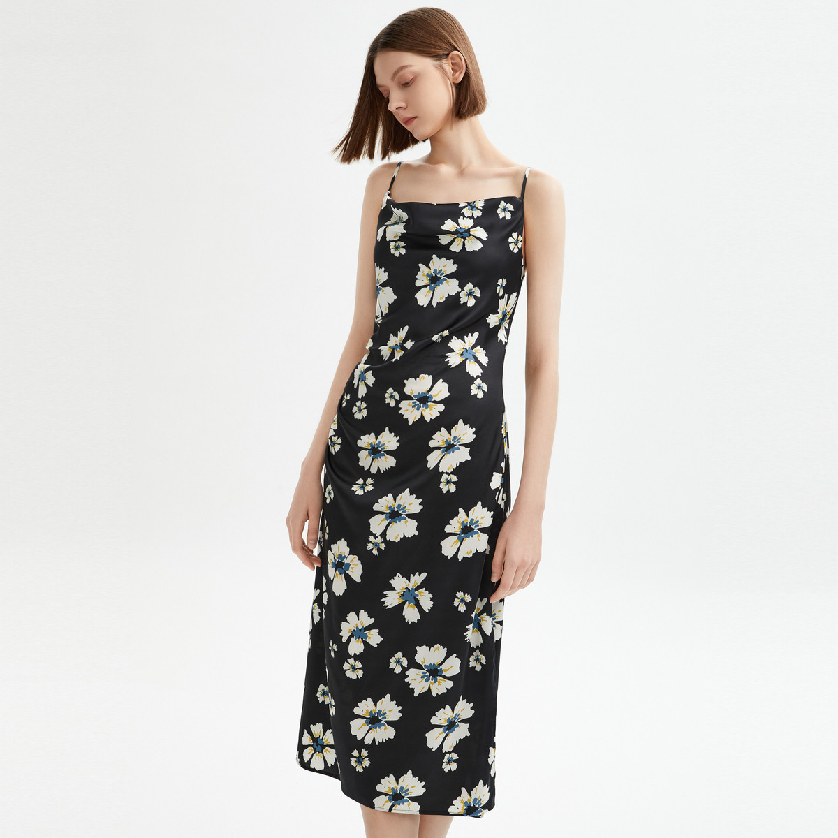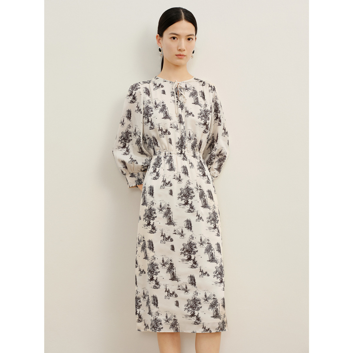 玖姿旗下安娜蔻系列法式轻熟风复古手绘印花缎面连衣裙女秋季 411596