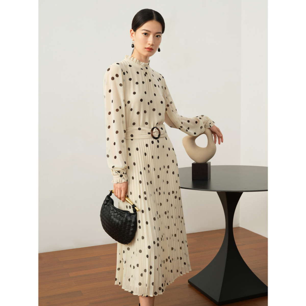 玖姿旗下安娜蔻系列法式复古波点收腰雪纺印花连衣裙女秋季 050124