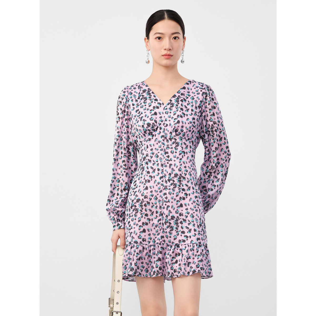 玖姿旗下安娜蔻系列V领豹纹印花收腰雪纺中长款连衣裙女秋季 231692
