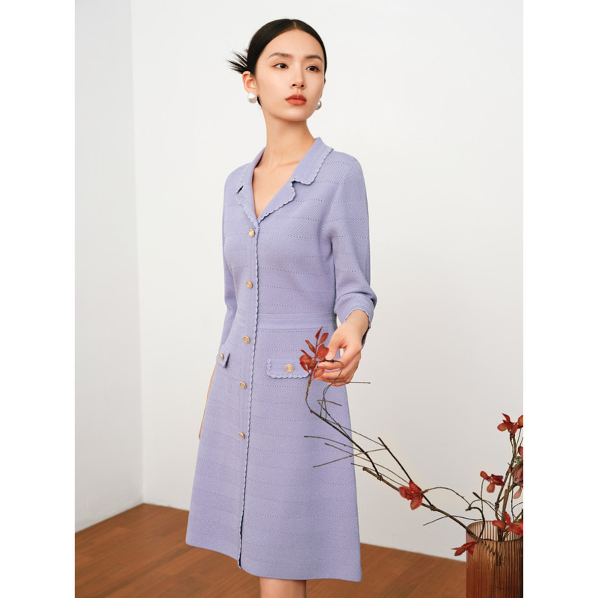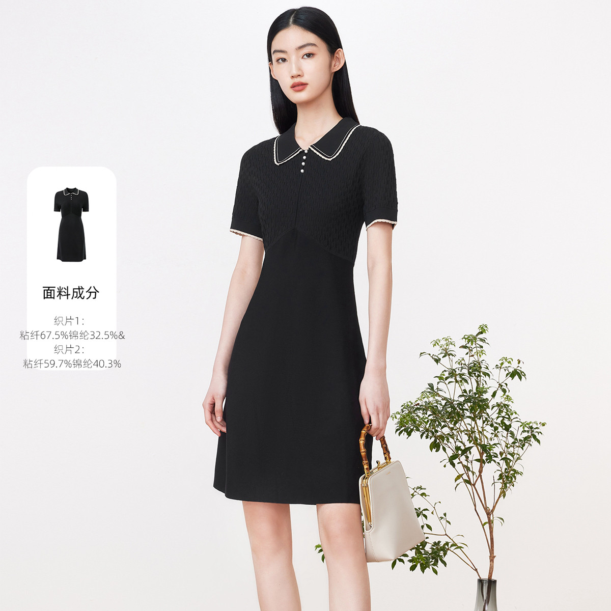 JZ玖姿夏季时尚小香风珍珠翻领修身连衣裙 418572