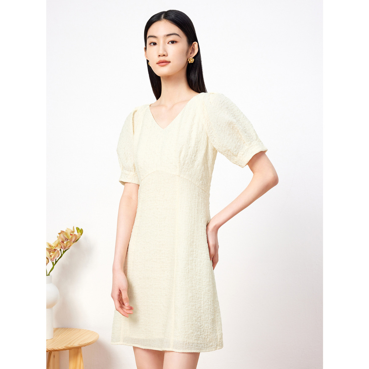 玖姿旗下安娜蔻系列法式泡泡袖系带收腰肌理感连衣裙夏季 548940