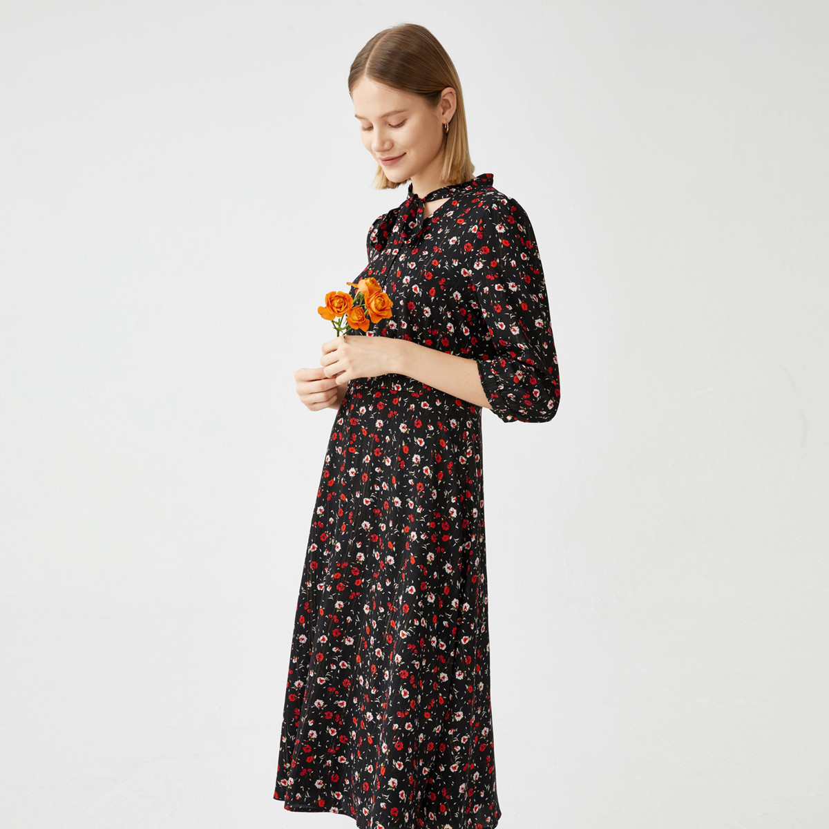 JUZUI玖姿春季黑色气质碎花收腰女连衣裙 358476