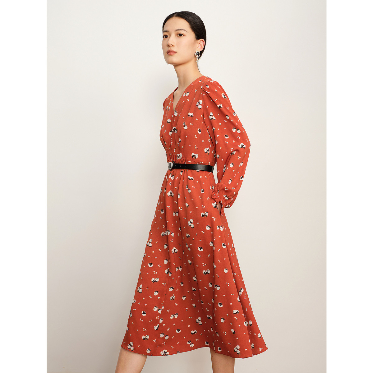 玖姿旗下安娜蔻系列V领长袖复古抽褶雪纺印花长款连衣裙女季 635916