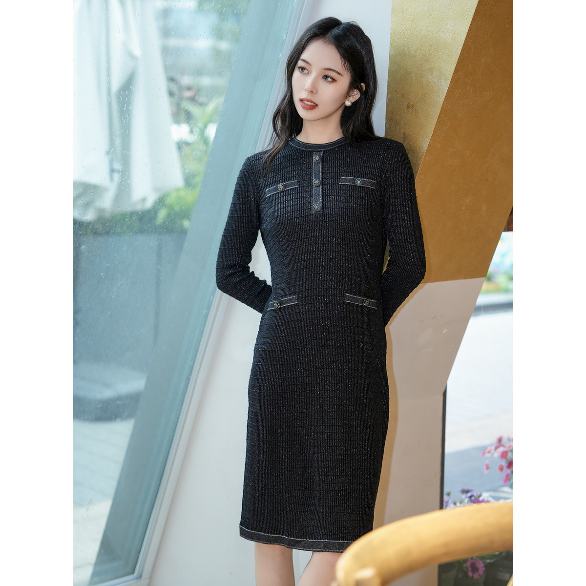JZ玖姿法式小香风针织连衣裙女装春季黑色简约长款裙子 774028