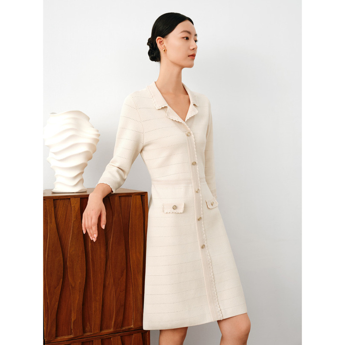 玖姿旗下安娜蔻系列手钩镂空X型曲珠纱七分袖毛衫连衣裙女秋 630604