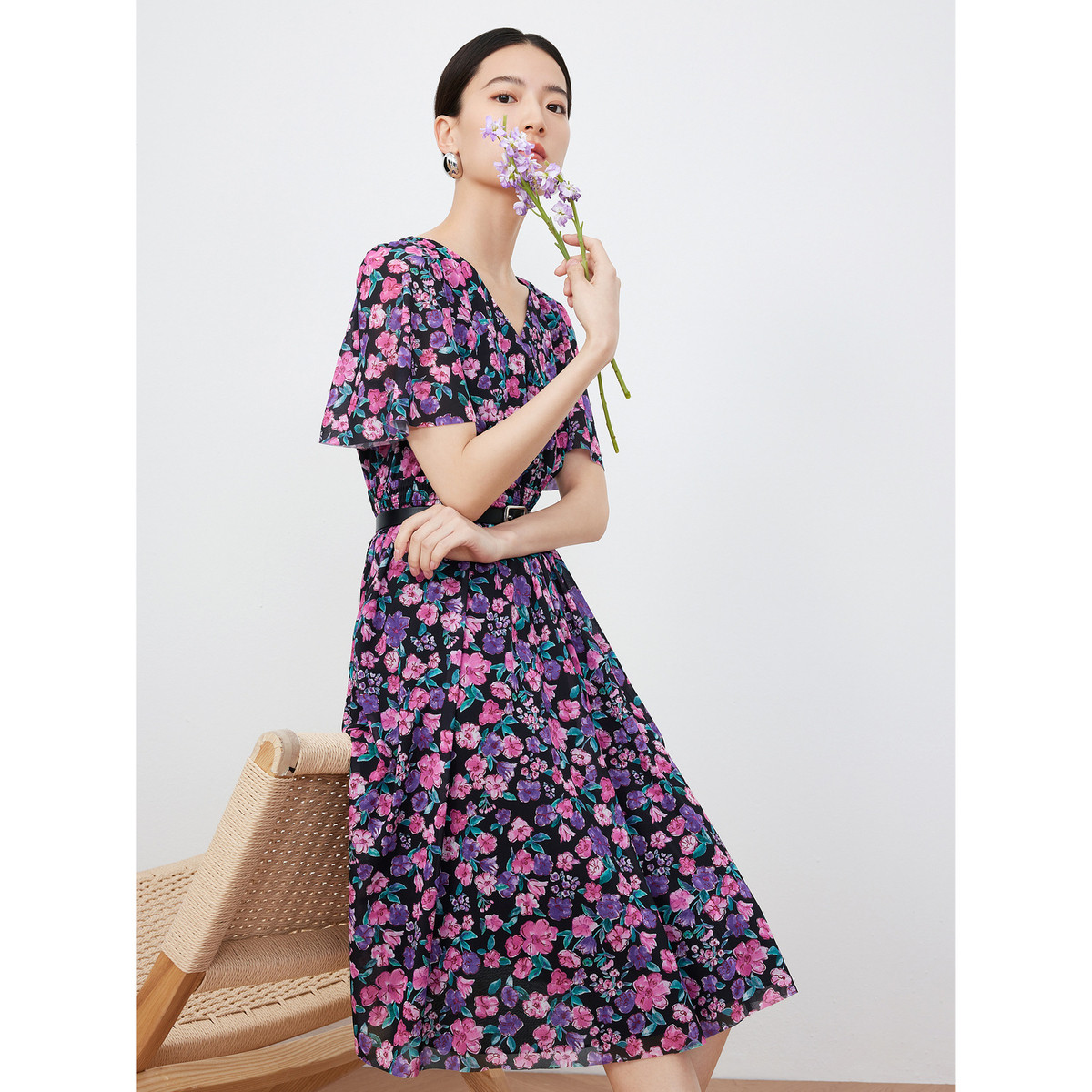 玖姿旗下安娜蔻系列碎花连衣裙女装夏季收腰V领裙子 092620