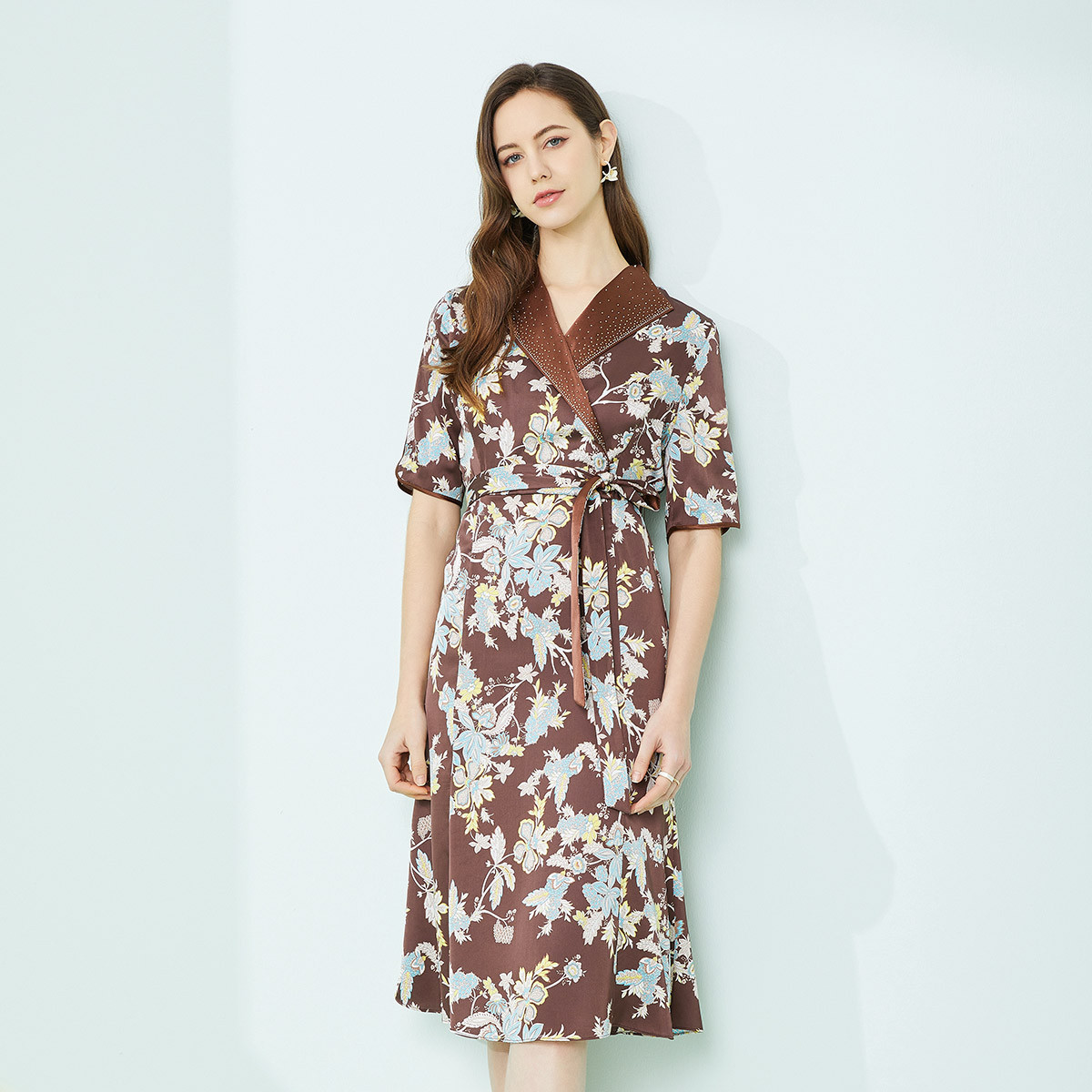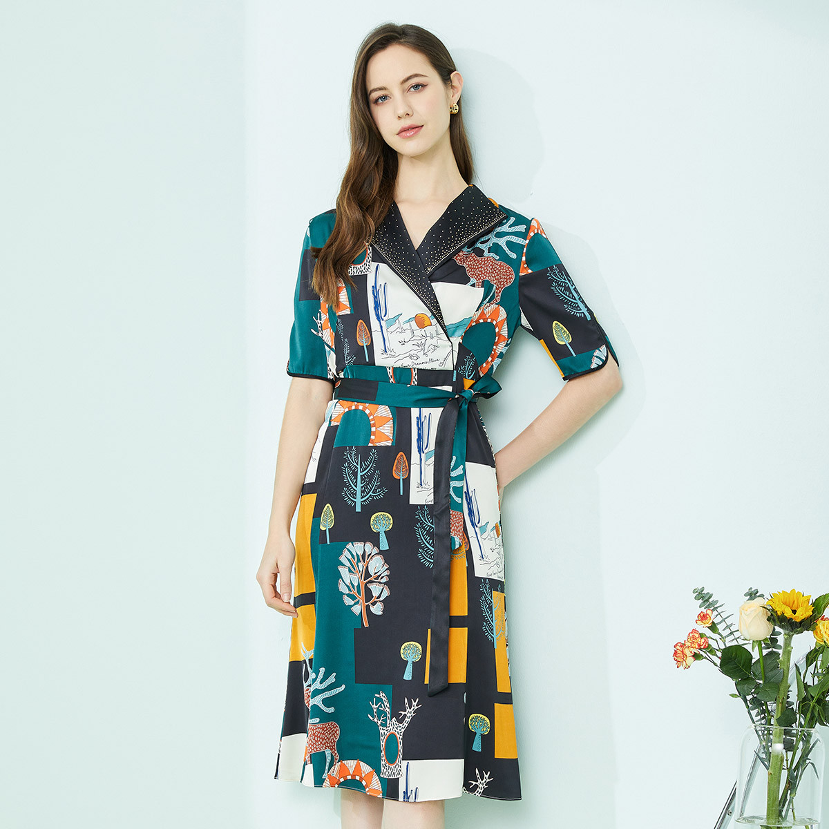 [桑蚕丝]夏季小V领淑女浪漫印花舒适合体修身短袖连衣裙 602335