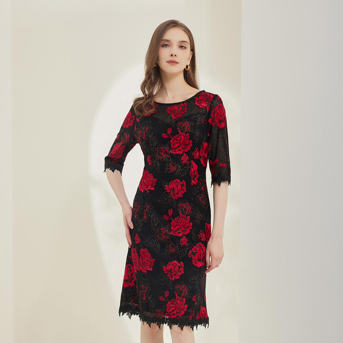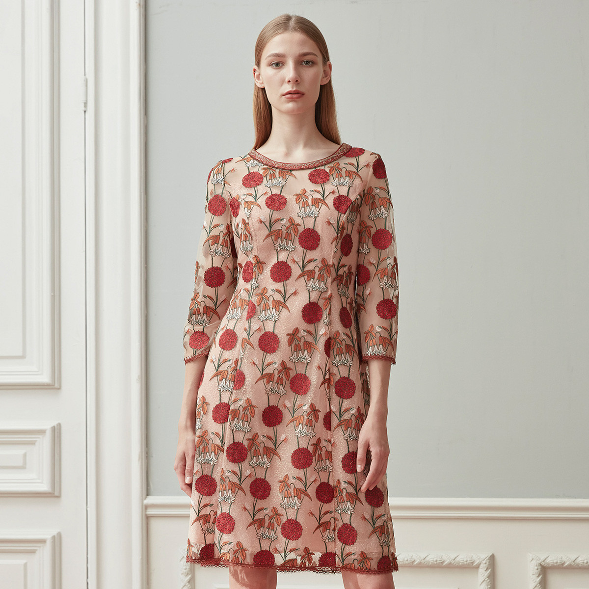 秋季轻熟风圆领时尚蕾丝印花中长款连衣裙商场同款 903647
