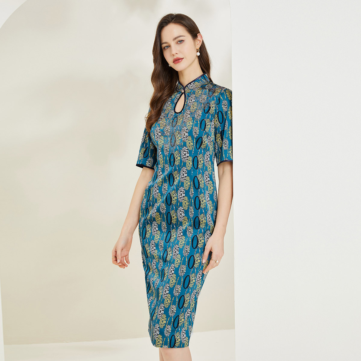 秋季撞色印花立领烫钻修身端庄旗袍连衣裙 906591