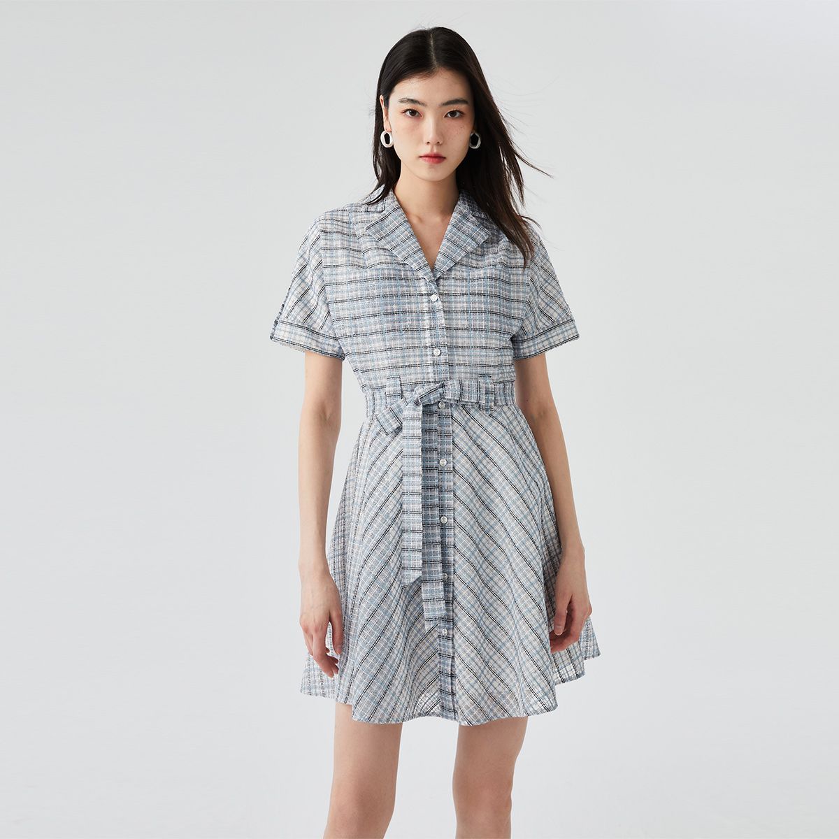 【小香风】专柜款夏中长蝙蝠短袖翻领收腰通勤连衣裙 477457