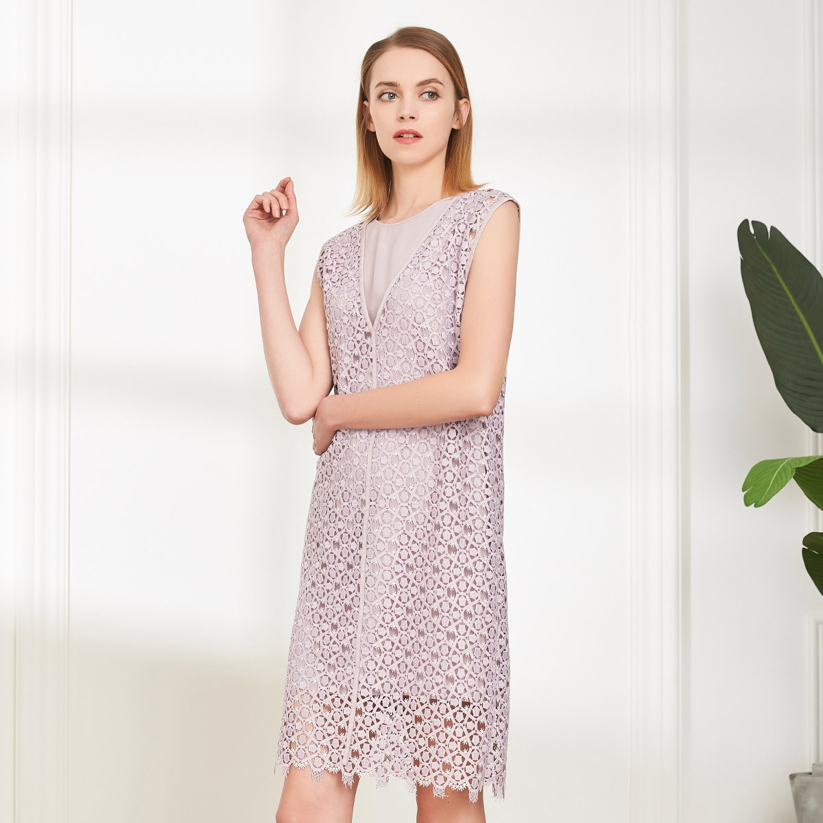 夏季温柔气质丝质时尚蕾丝相拼修身淑女中长款连衣裙 879839