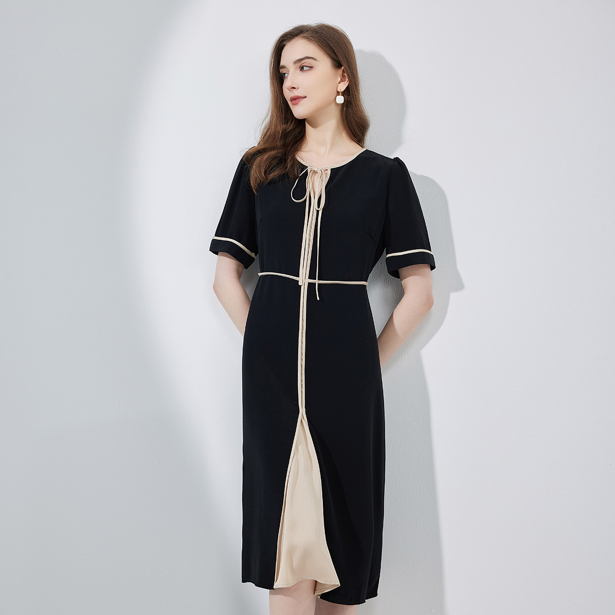 连衣裙春夏时尚圆领蝴蝶结中长拼色收腰显瘦通勤连衣裙 407391