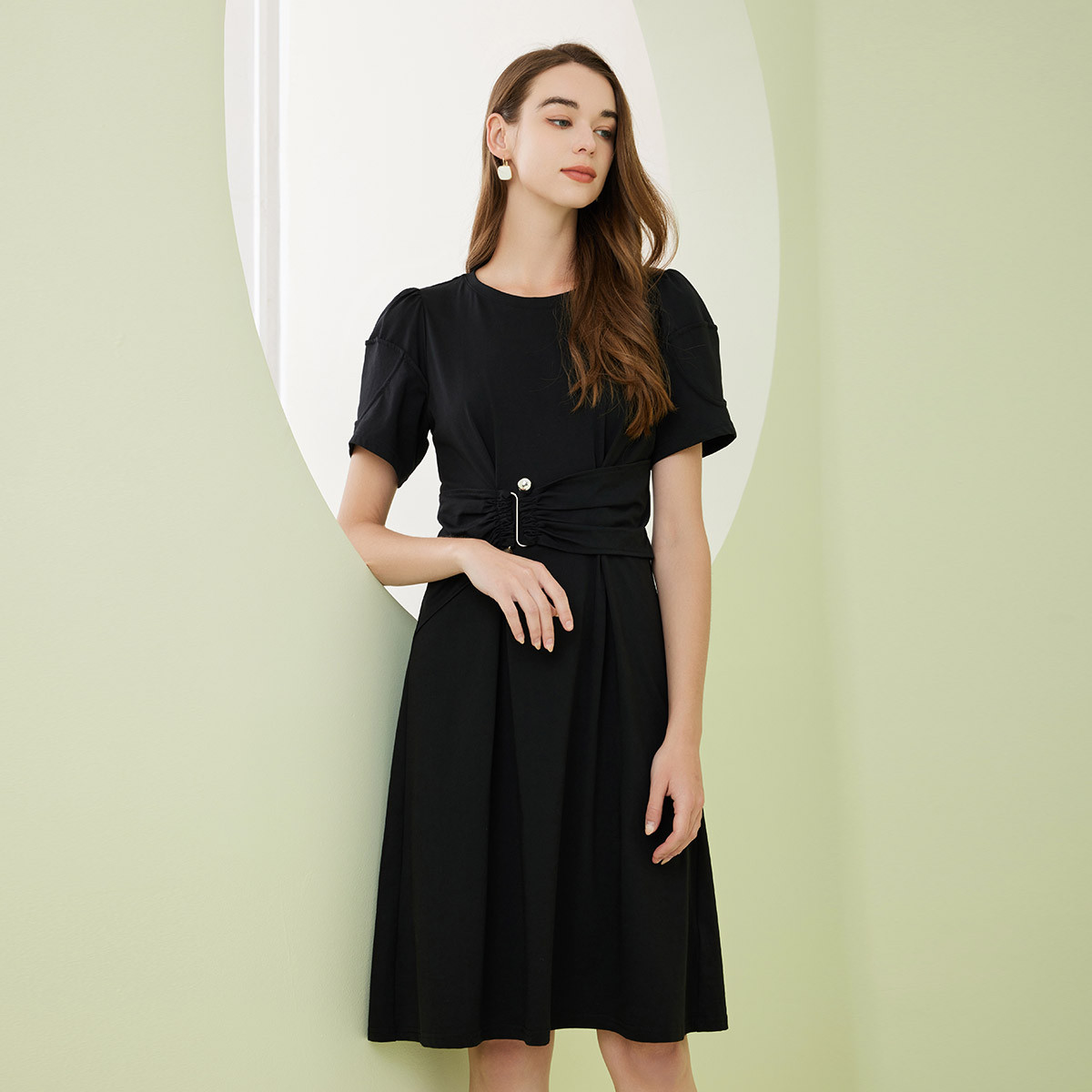 春夏洋气腰间褶皱设计感显瘦中长连衣裙小黑裙 395231