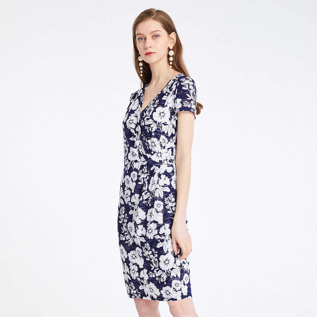 春夏V领短袖修身印花优雅气质连衣裙 125727