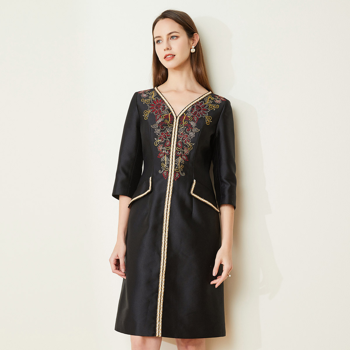 秋冬V领撞色织带烫钻礼服款连衣裙 350559