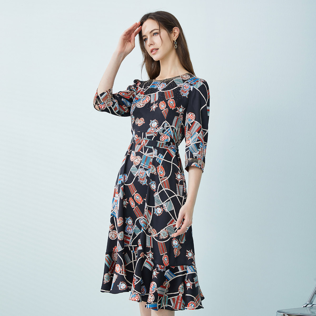 商场同款春季暗黑系复古港风印花圆领立体剪裁连衣裙 402015