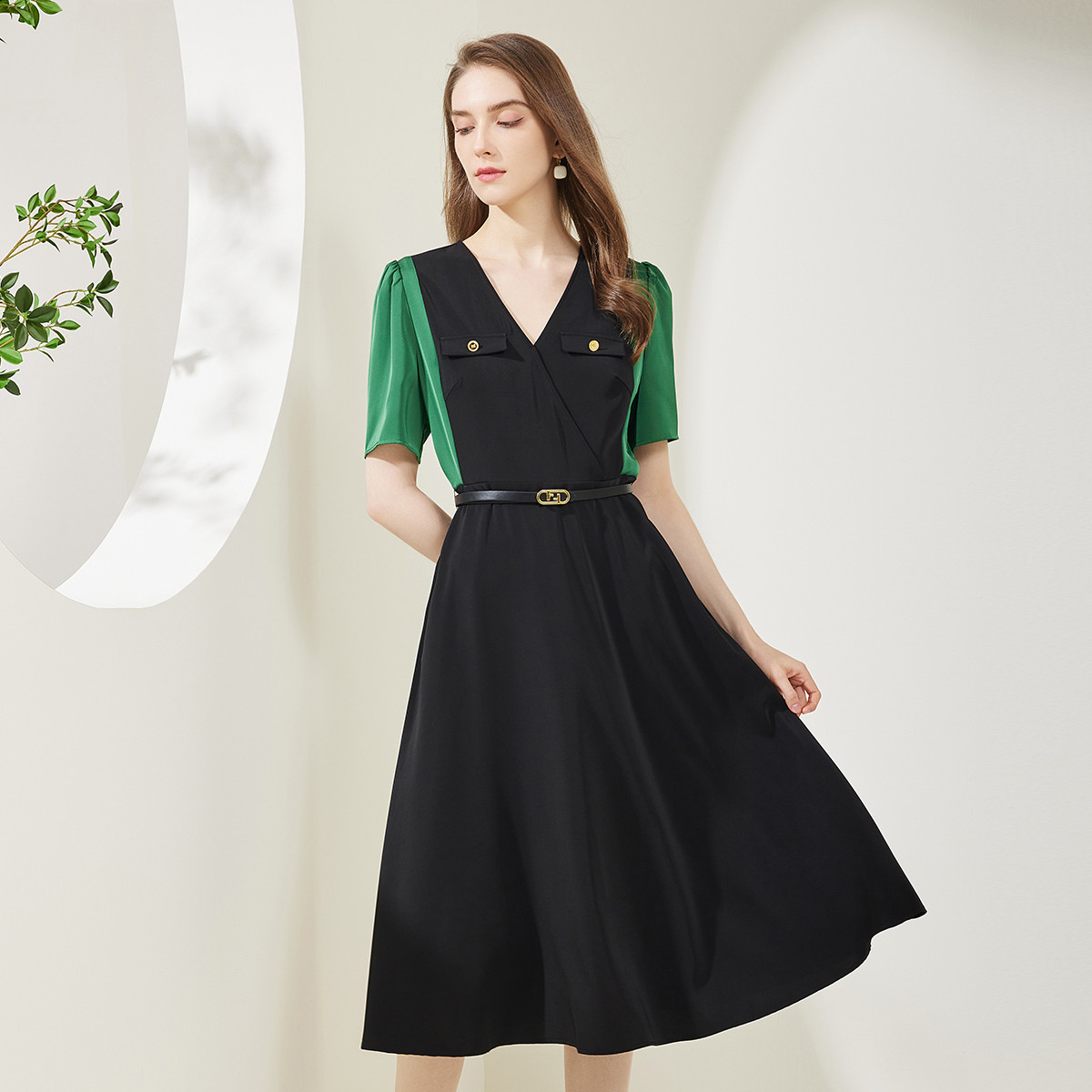 夏季装饰拼接中长OL通勤系腰带修身气质连衣裙 880799