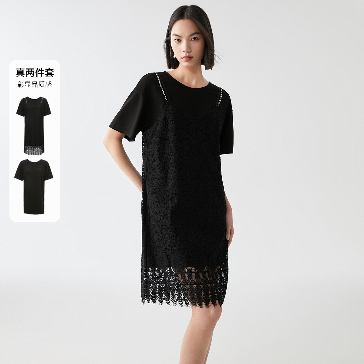 【小香风夏季】春夏可拆链条蕾丝拼接T恤连衣裙气质百搭时尚 541009