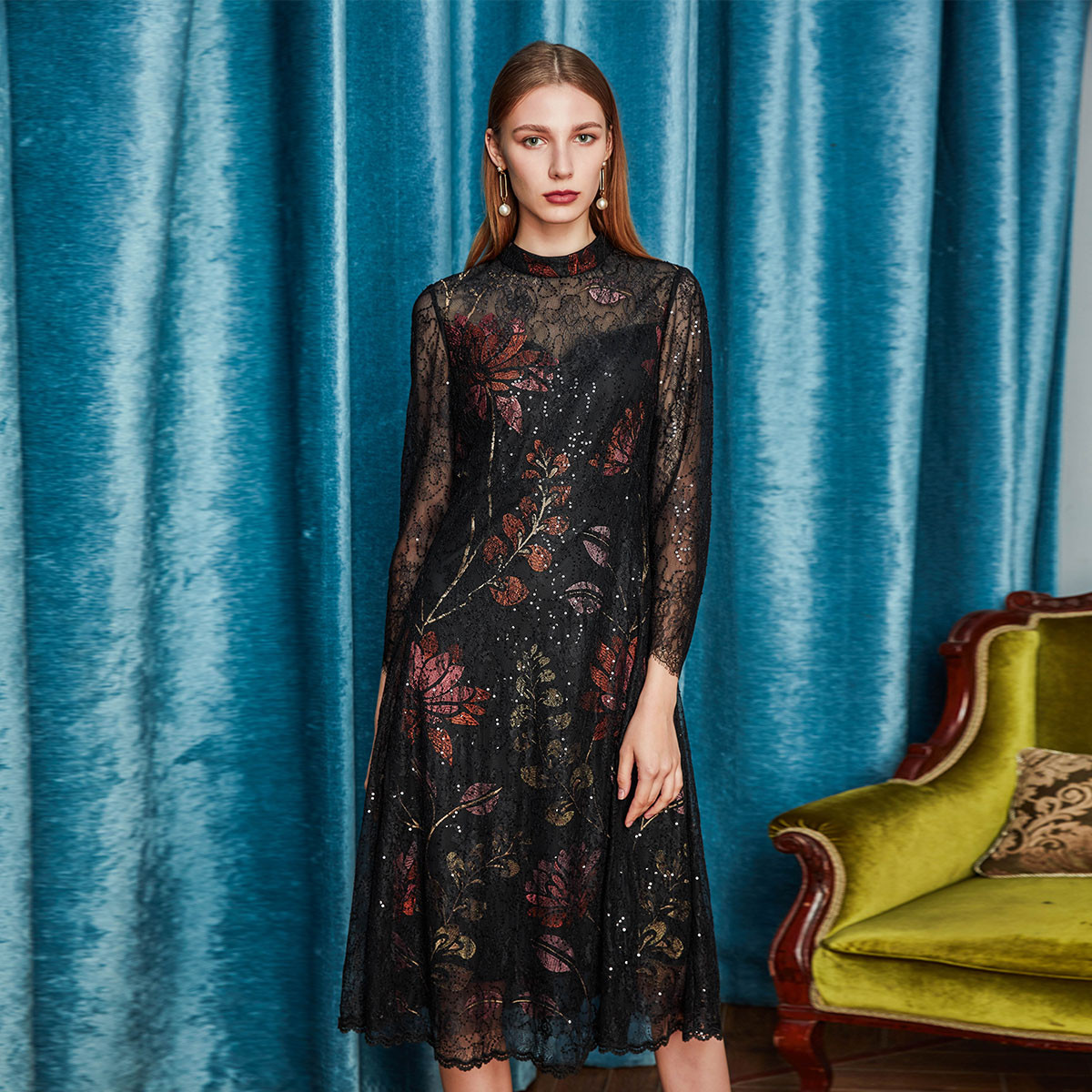 夏季圆领浪漫蕾丝长袖合体连衣裙 824031