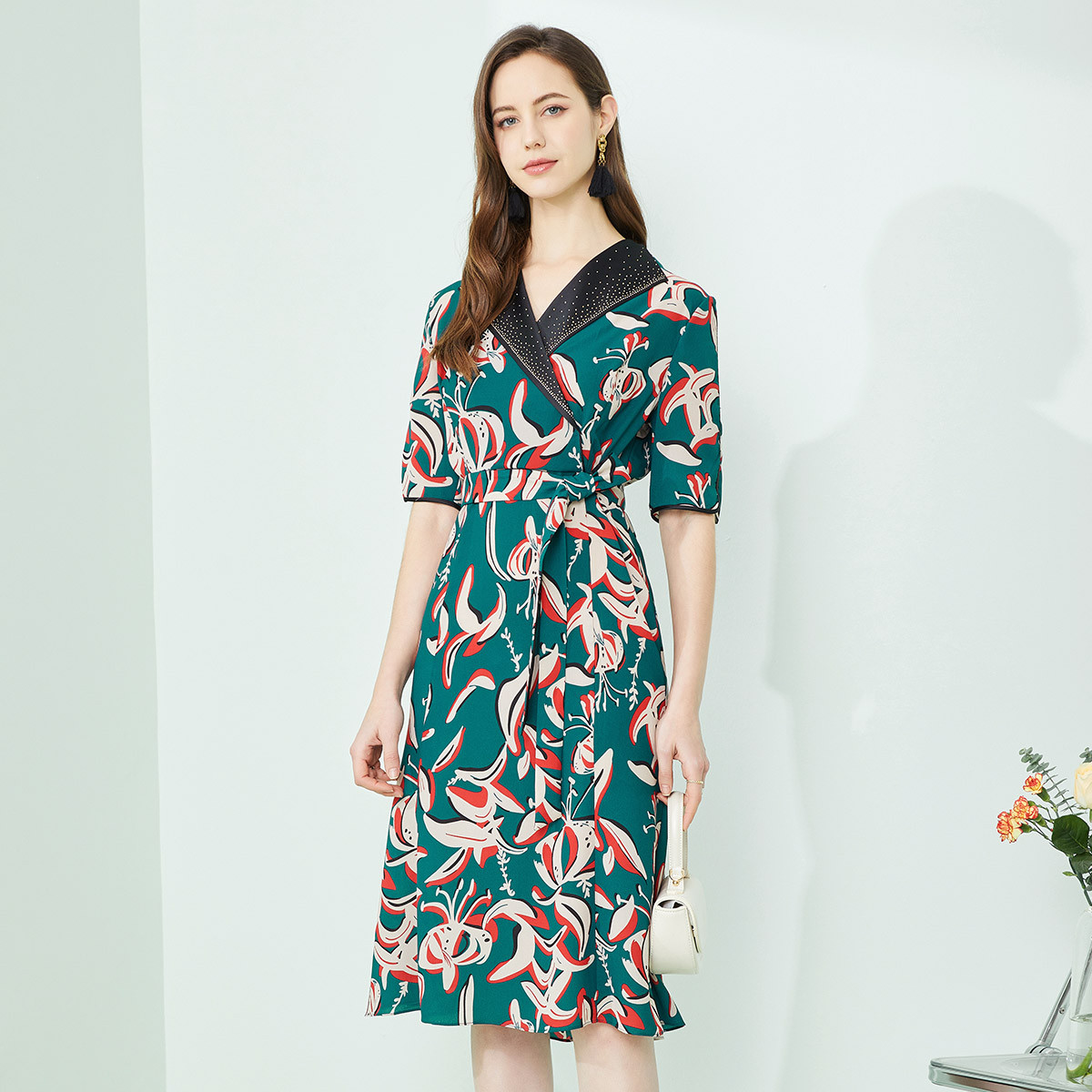 【商场同款】春夏V领收腰七分袖休闲衬衫式连衣裙气质百搭时尚 633041