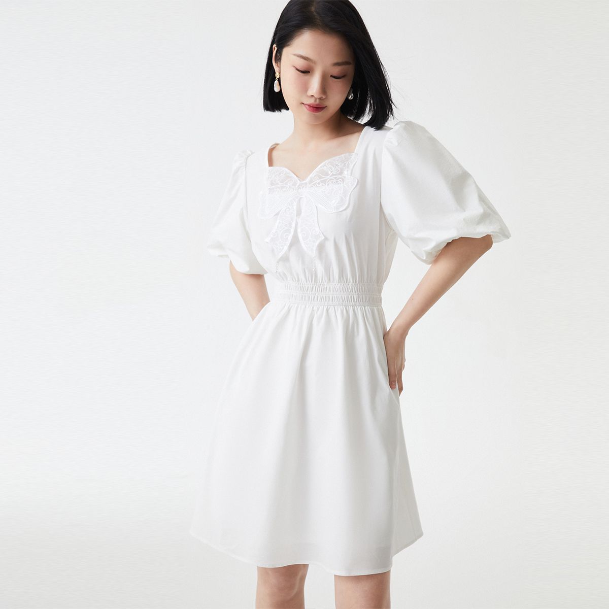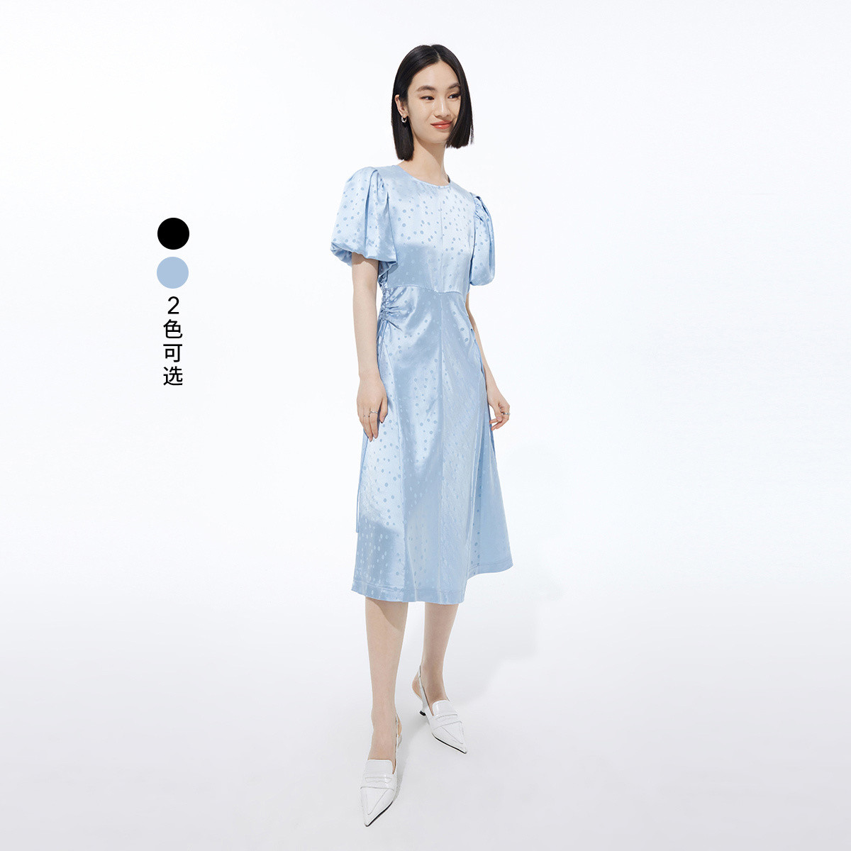 【亮丝蝴蝶结装饰】商场同款泡泡袖A字裙收腰设计连衣裙 984401