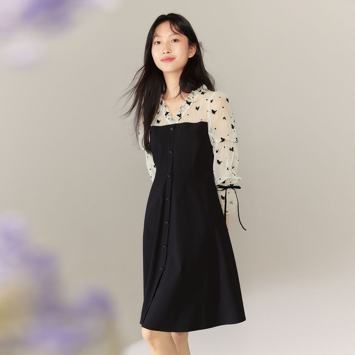 【蝴蝶剪影植绒印花拼接设计】收腰显瘦专柜款袖口绑带连衣裙 676497