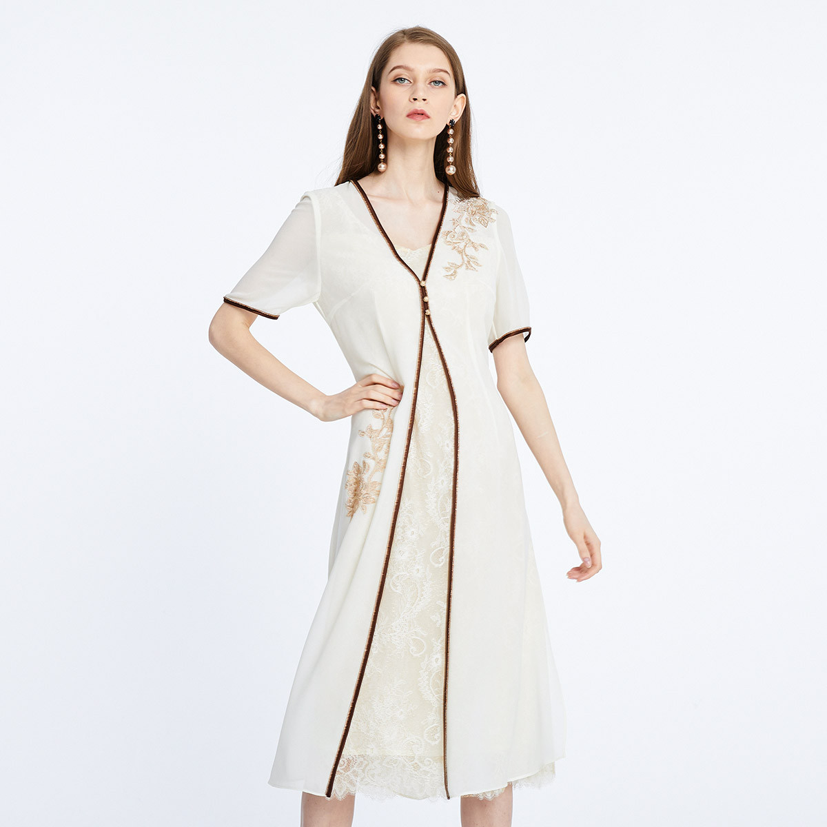 夏季温柔气质丝质时尚蕾丝相拼修身淑女中长款连衣裙 879839