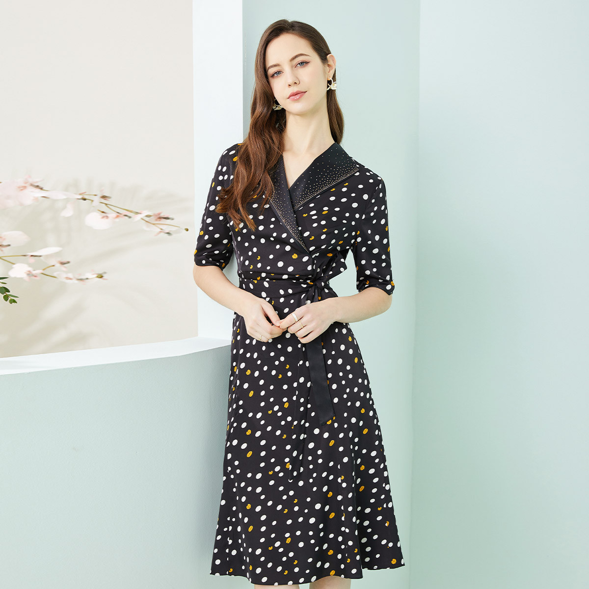 商场同款秋季复古彩色波点经典优雅西装撞色翻领显瘦连衣裙 613855