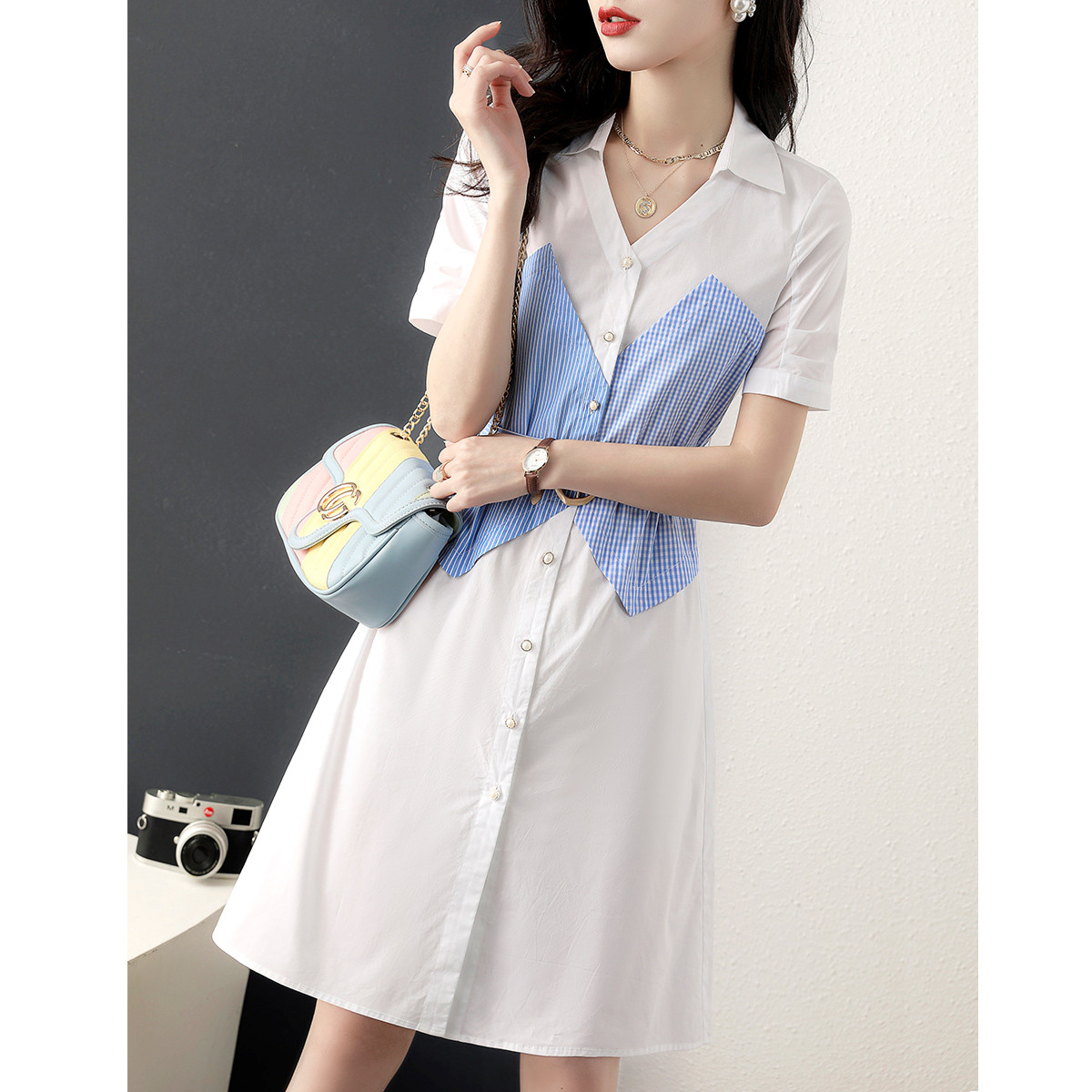 2025夏季新款文艺休闲藏肉修身显瘦减龄拼接条纹衬衫连衣裙 463753