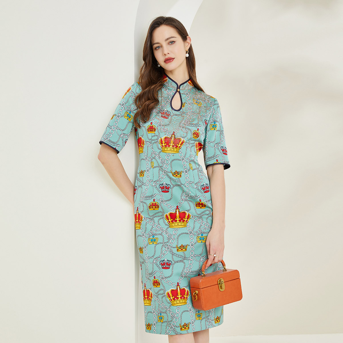 港风链条皇冠印花撞色修身旗袍裙连衣裙春夏款 894303