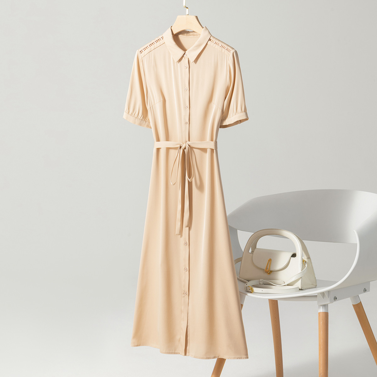 【弹力桑蚕丝】夏季衬衫裙显瘦纯色百搭单排扣纯色裙子女 365139