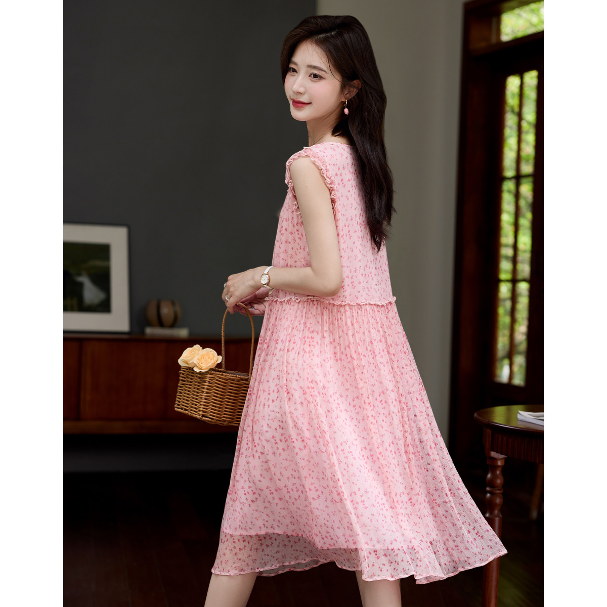 【韩系插画风】夏优雅圆领无袖大摆显瘦飘逸桑蚕丝连衣裙 576449