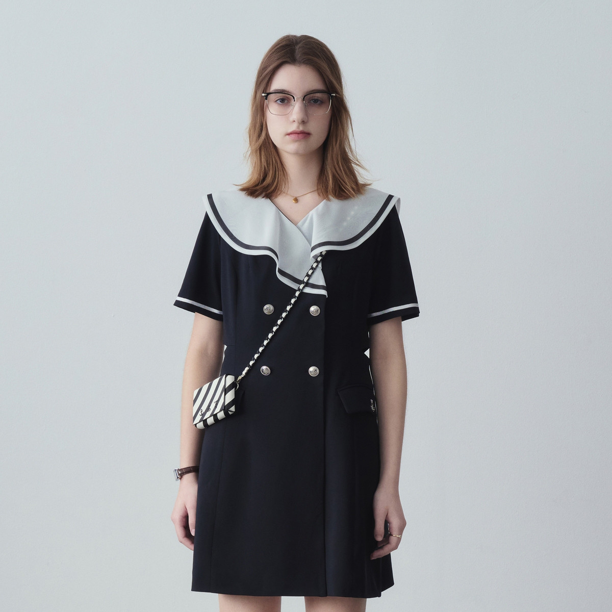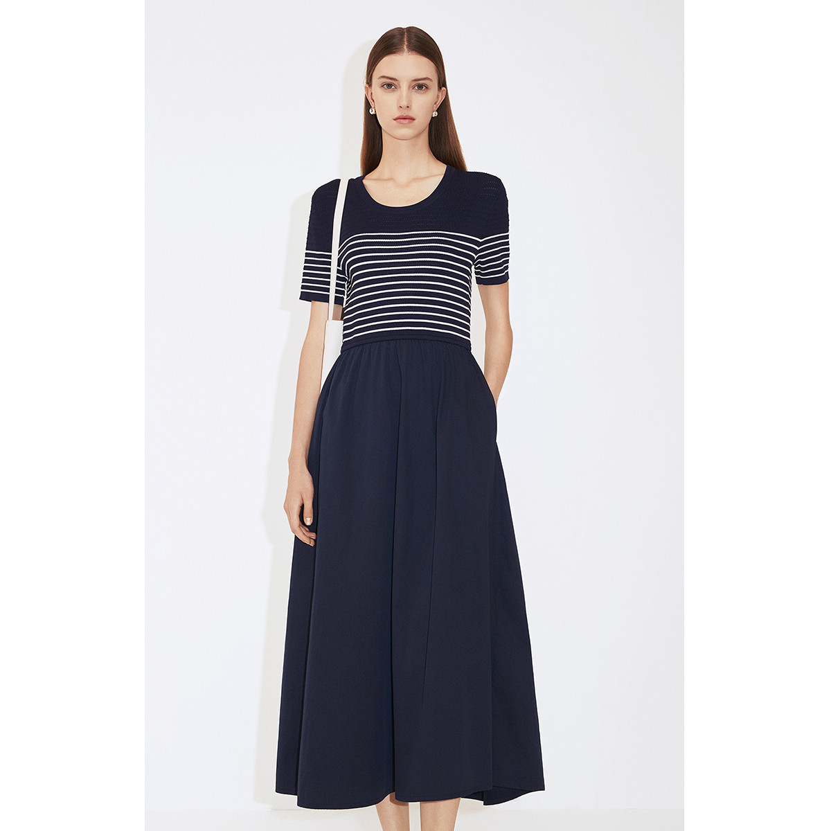 小熊夏季款海军领连衣裙中长款收腰气质裙女士 042561