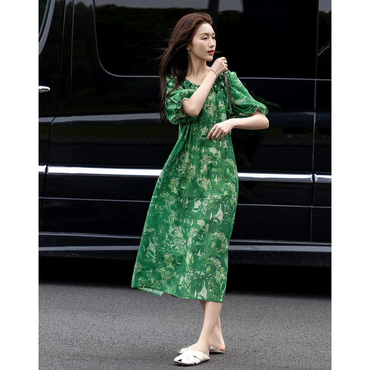 连衣裙女2025夏季新款法式气质方领褶皱收腰显瘦时尚裙子 608408