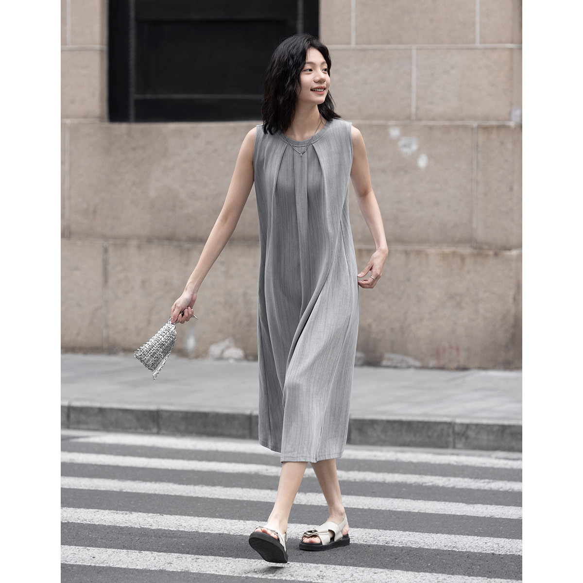 【垂坠感无袖连衣裙】夏圆领后中分割设计中长款连衣裙 743042