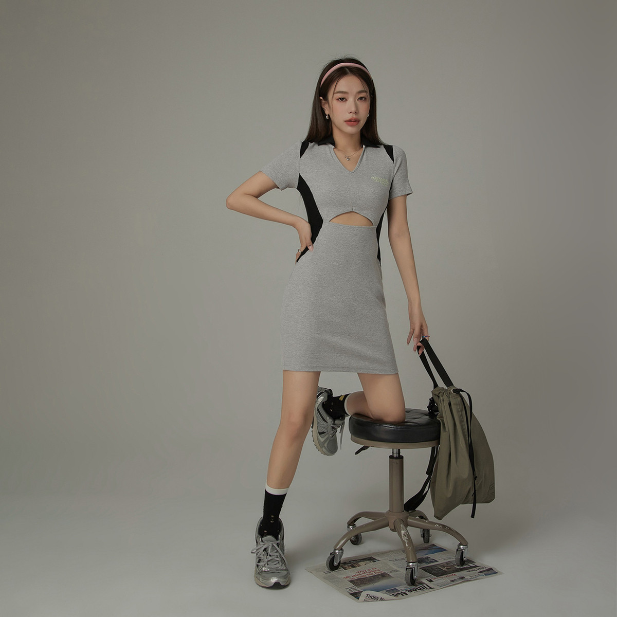 镂空拼接连衣裙女夏V领露腰绣花修身短袖裙子 716051