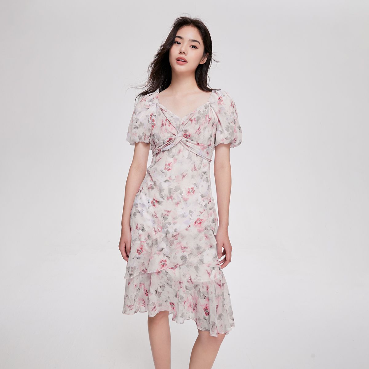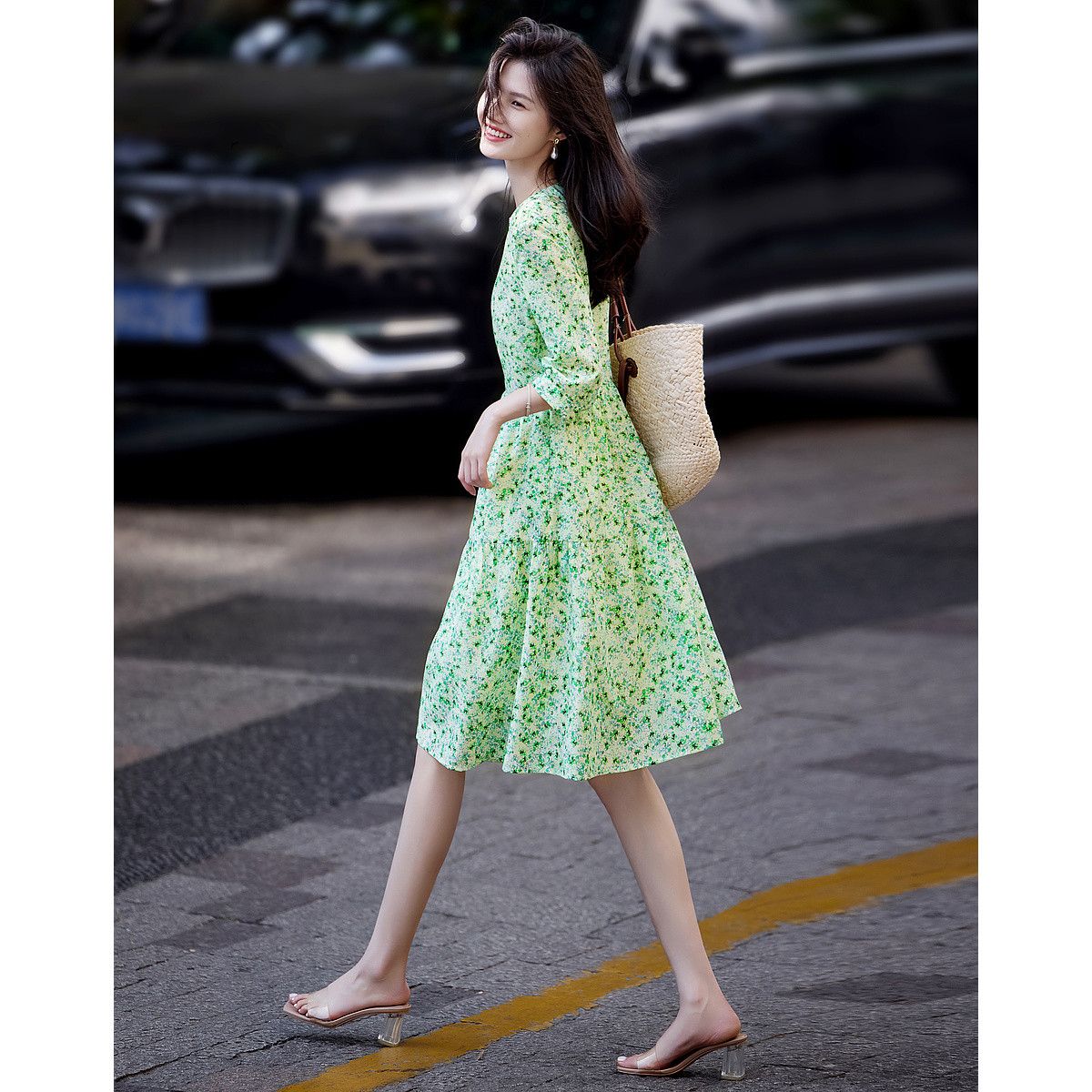 【气质百搭】秋季时尚甜美泡泡袖V领中裙碎花连衣裙女 957146