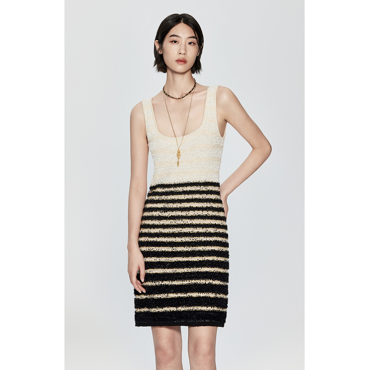 春季纸片纱金葱小香风条纹吊带针织连衣裙 594383