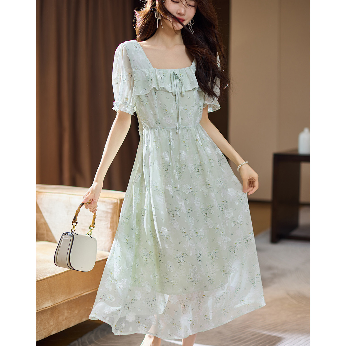 2025夏季新款荷叶边雪纺印花连衣裙女装飘逸灵动中长裙子女装 274633